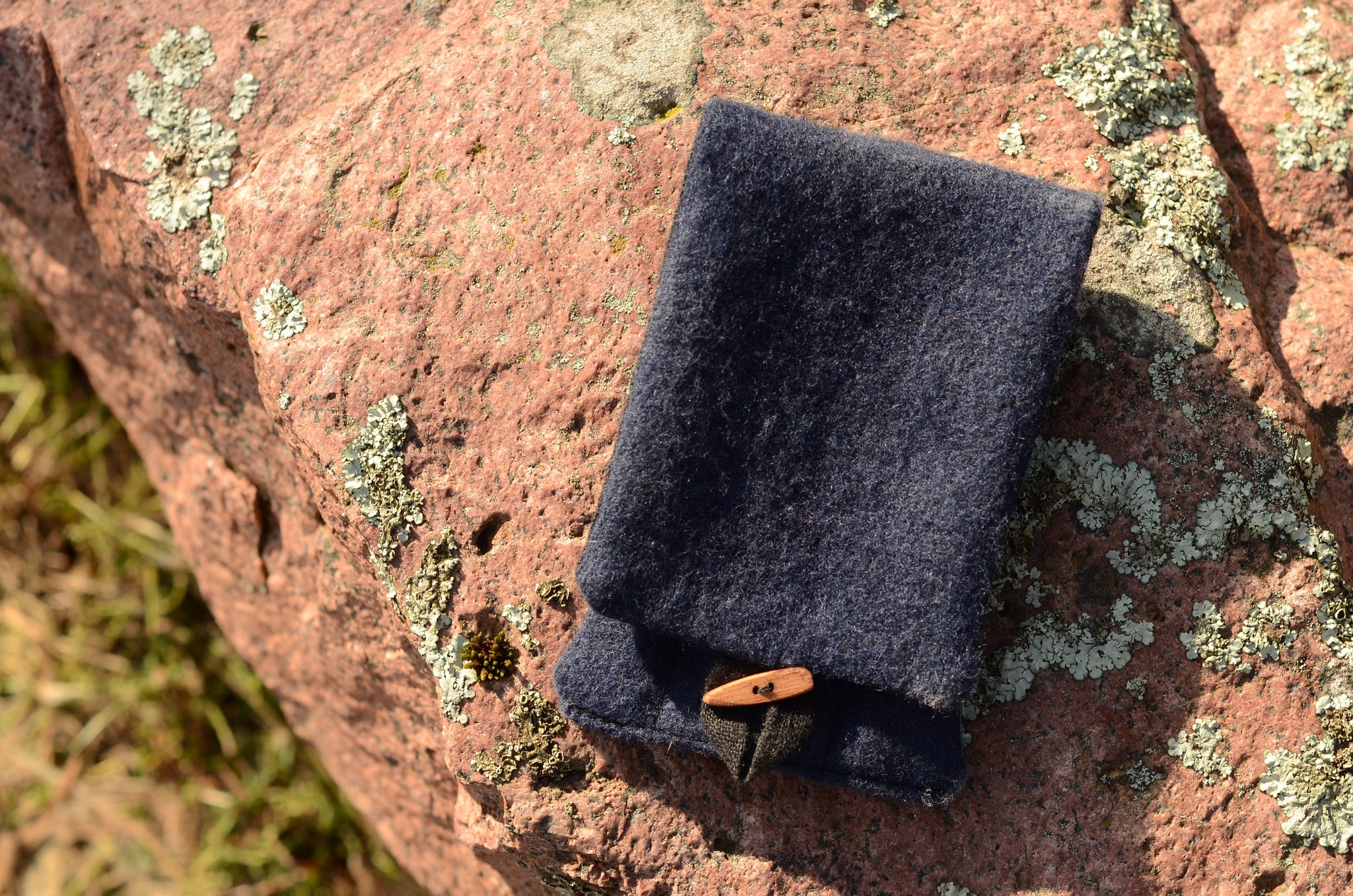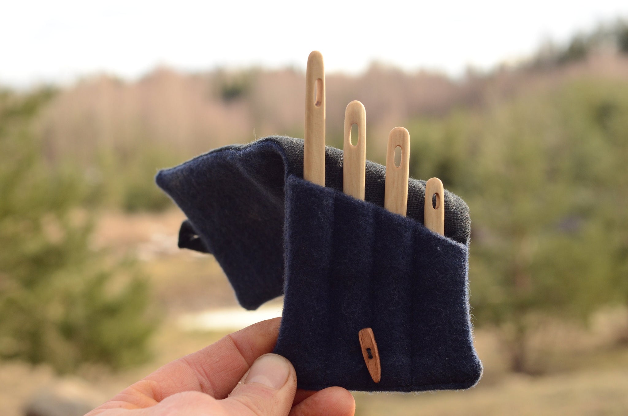 Set of 4 wooden needles with woolen-linen case! (UPDATE: Now we offer charcoal grey herringbone woolen-linen case.)