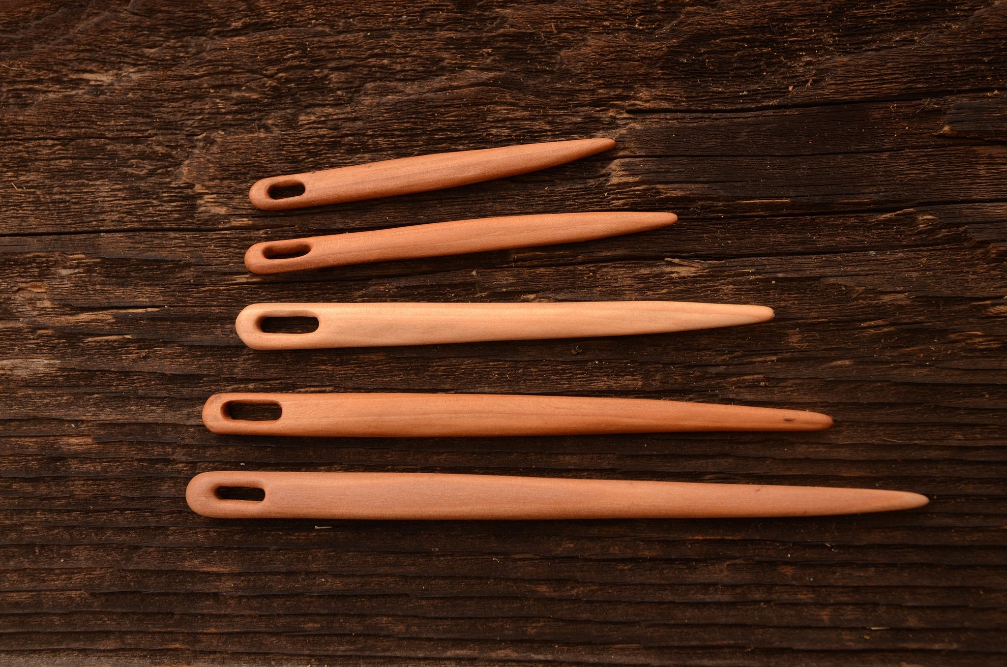 These 5 nalbinding needles are cut out from solid and elastic apple tree wood. Needles are with elongated eyes. Preserved with natural mineral oil and wax mix. No wrinkles, no sharp corners - don't damage yarn. The smooth finish moves easily through the stitches. Nalbinding needles will give you years of service.