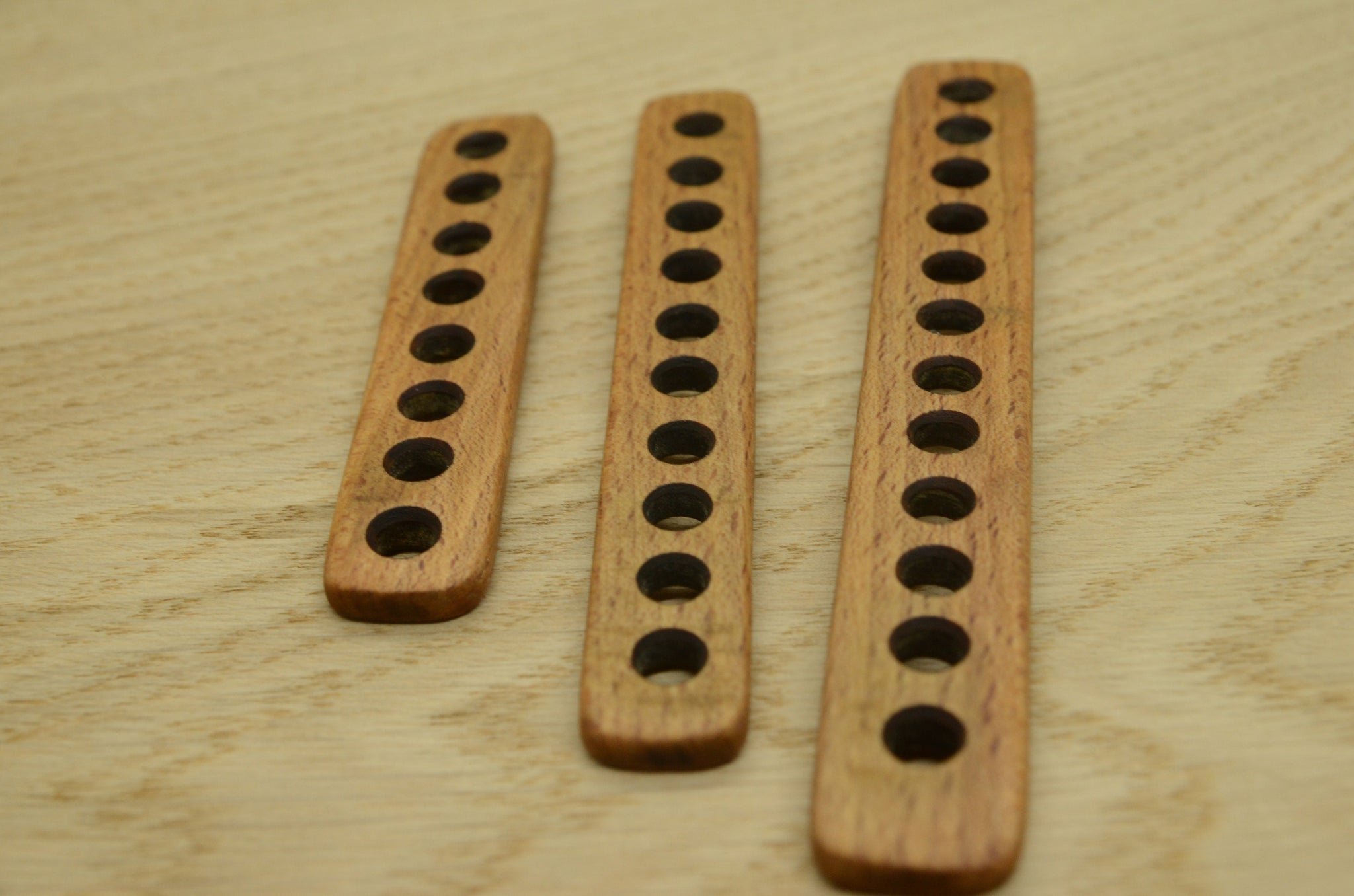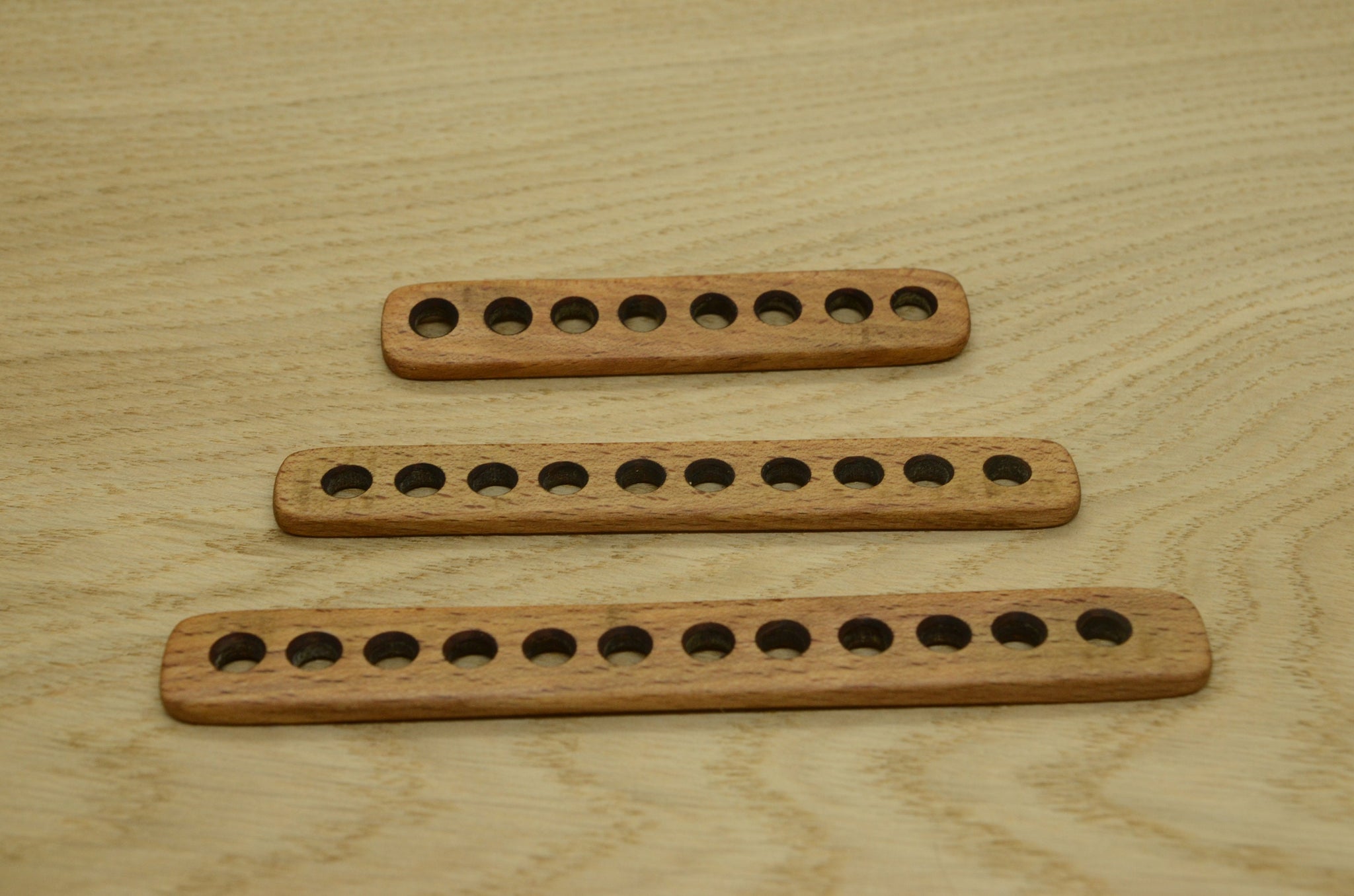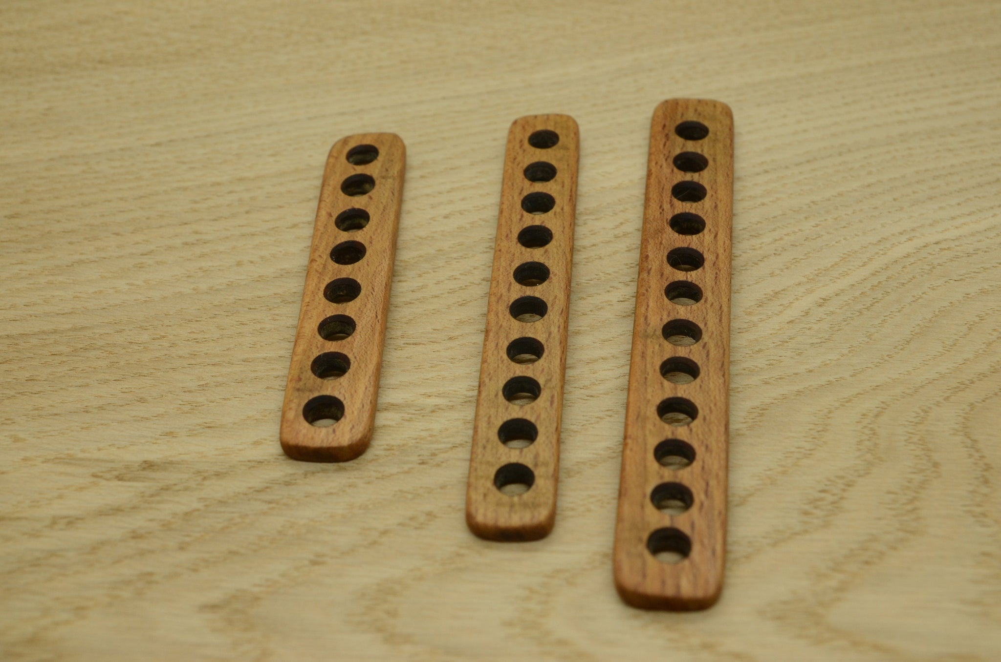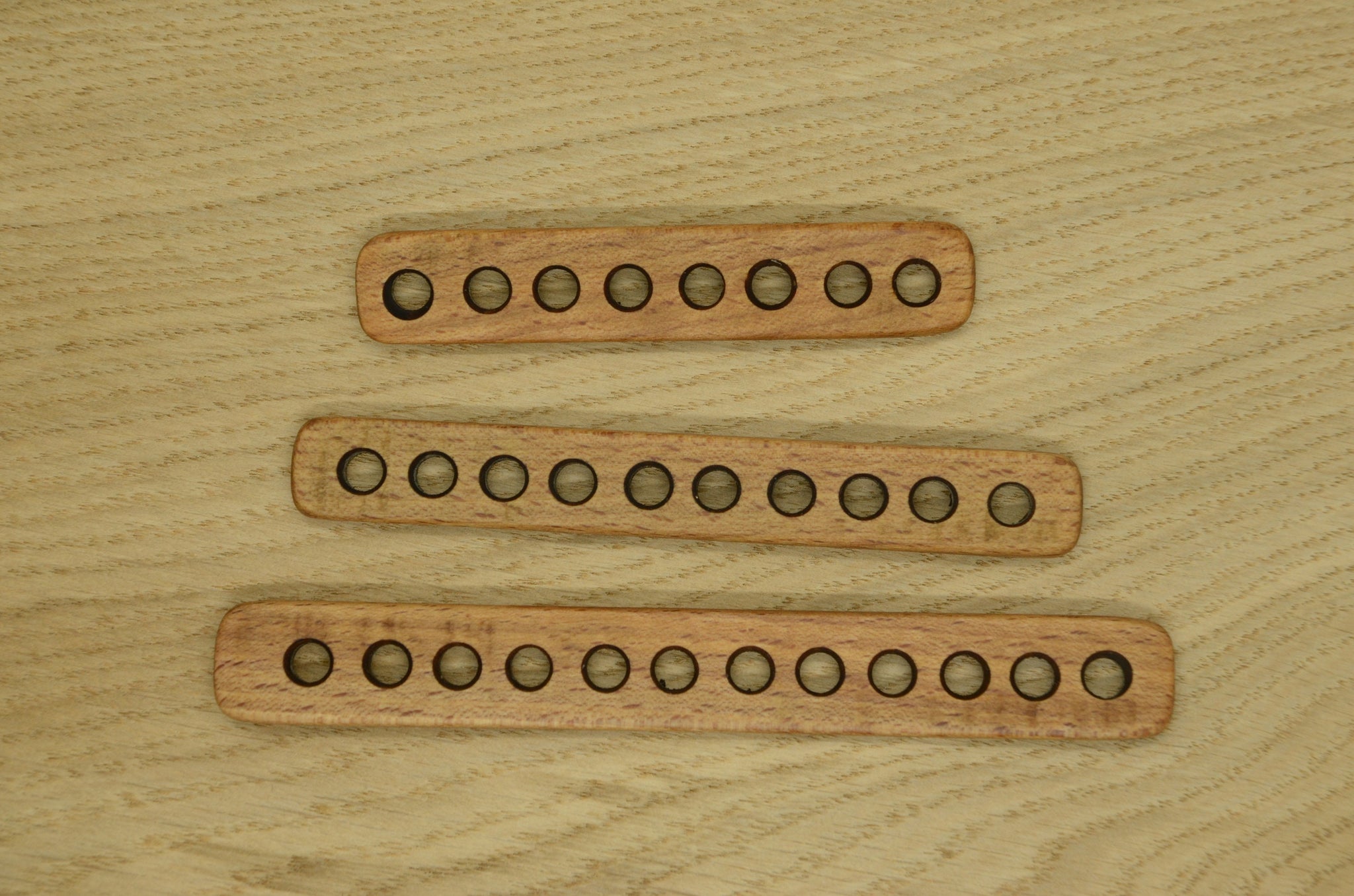 Separators are hand made of solid beech wood. Finished with natural wax and linen seed mixture. Edges of the holes are not sharp, so do not damage thread.
